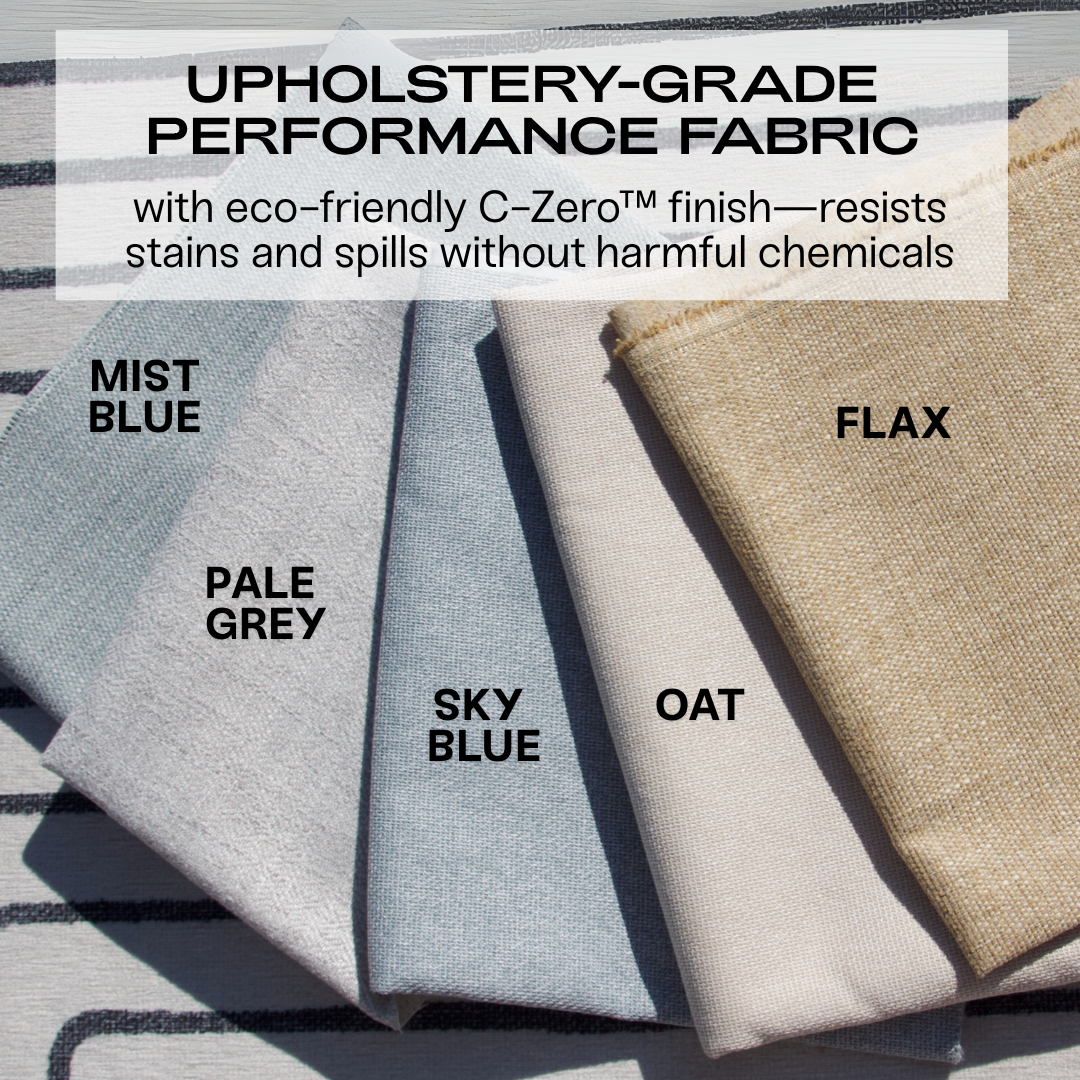 - Upholstery-grade performance fabric with eco-friendly C-Zero™ finish—resists stains and spills without harmful chemicals